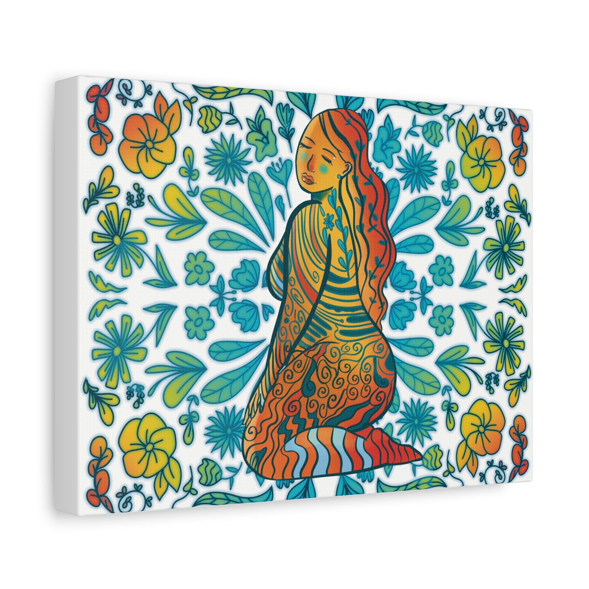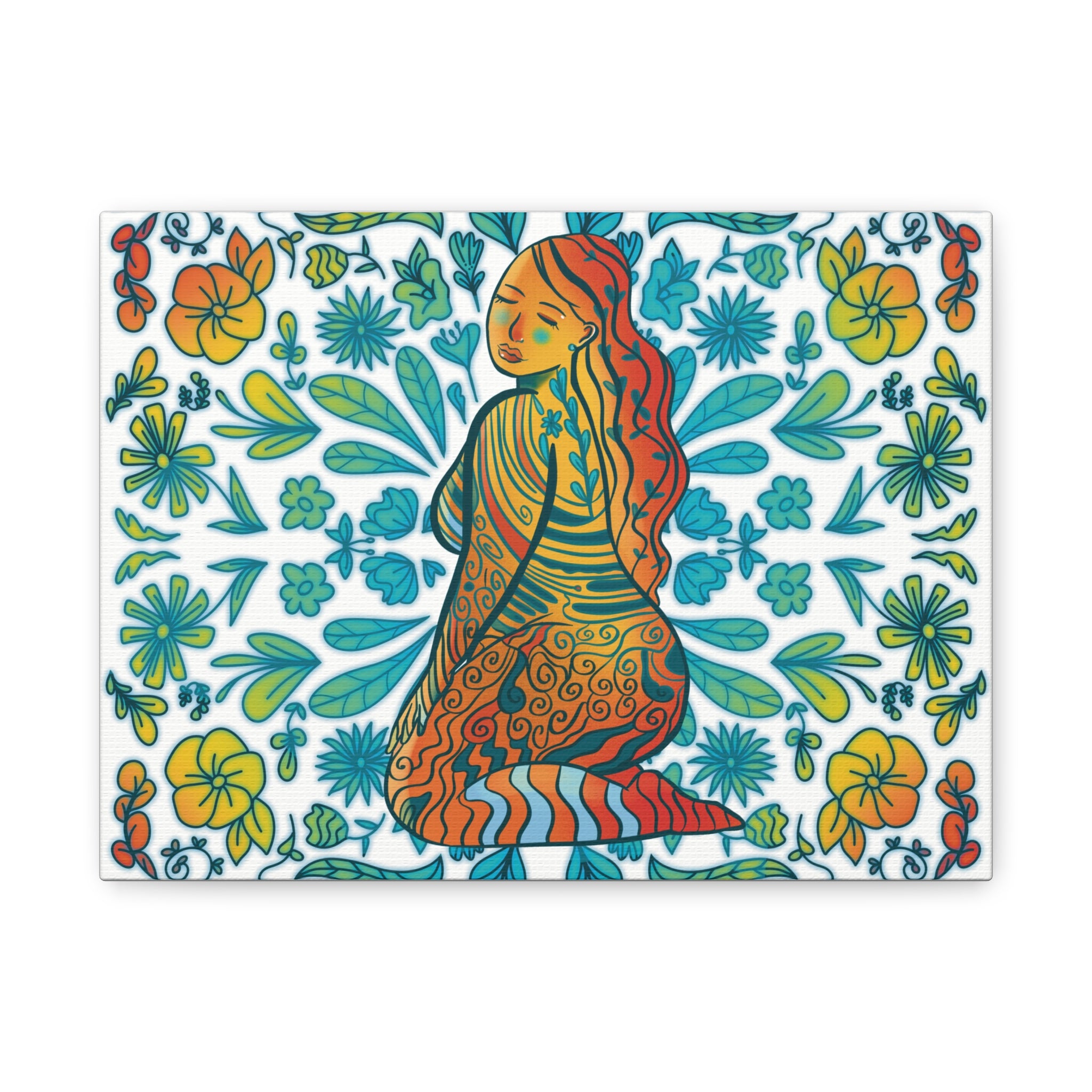 A vibrant stretched canvas print featuring the overflowing botanical motifs of turquoise, teal, yellow and coral of the March art from the 2026 Aurora Calendar. The piece delivers rich, durable color and a soft matte finish that reduces glare. Small soft rubber dots on the back keep the canvas steady when displayed, and a built-in hanging system makes installation simple. An easy to hang, beautiful addition to any wall.